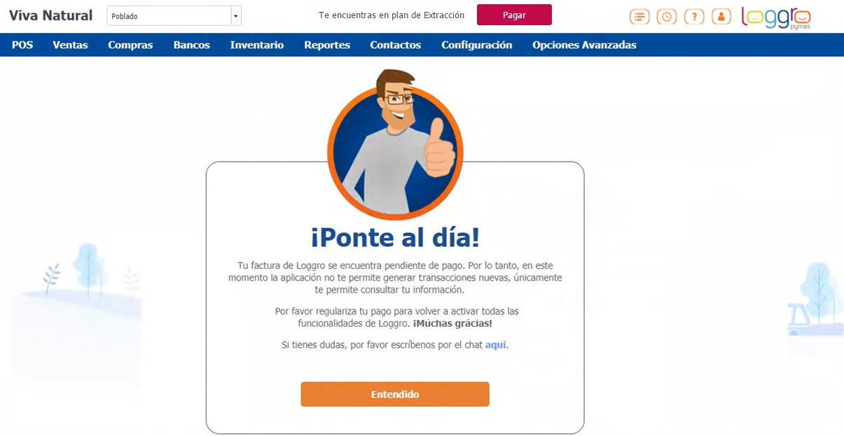 El estado de extracción es un proceso en cual una compañía solo tiene acceso a sus datos almacenados de manera informativa y no puede realizar transacciones en la aplicación, debido a que no ha sido registrado el pago de la mensualidad de Loggro.
