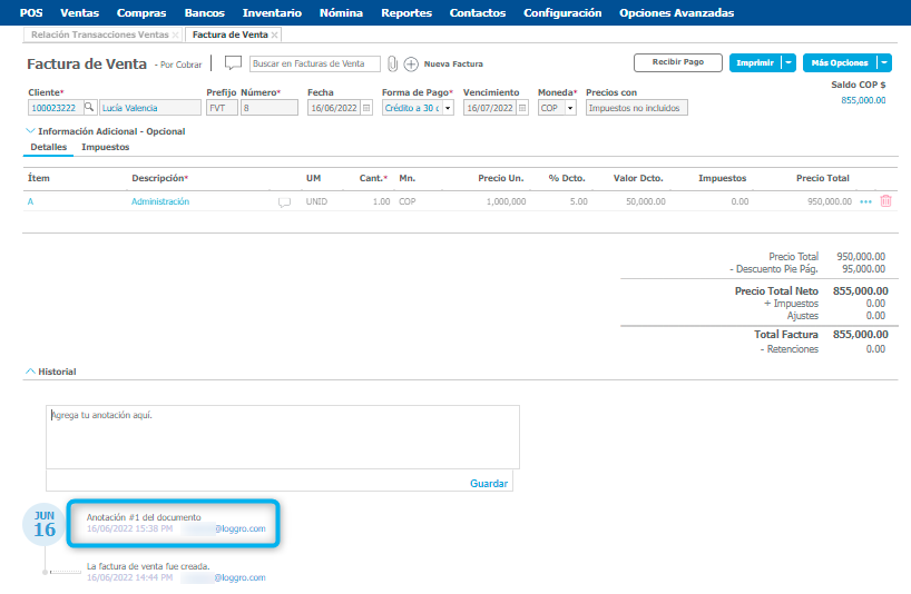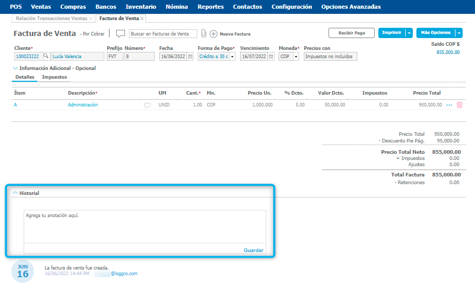 Al ingresar en una factura de venta y desplegar la opción de Historial, encuentras un campo de anotaciones en el cual puedes digitar comentarios o el seguimiento que tuviste del documento.