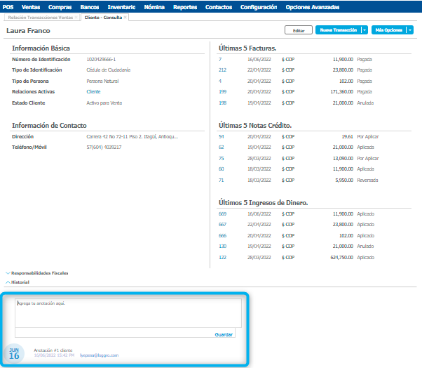 Desde las Facturas de Venta y la opción de Consulta de Clientes tienes la posibilidad de adicionar anotaciones importantes, estas permiten hacer un seguimiento a clientes o documentos generados.