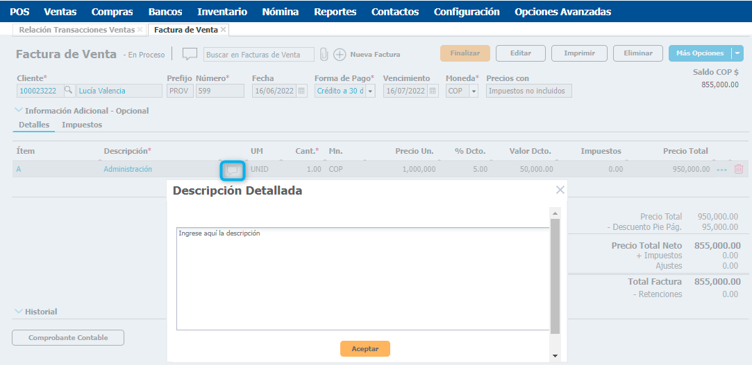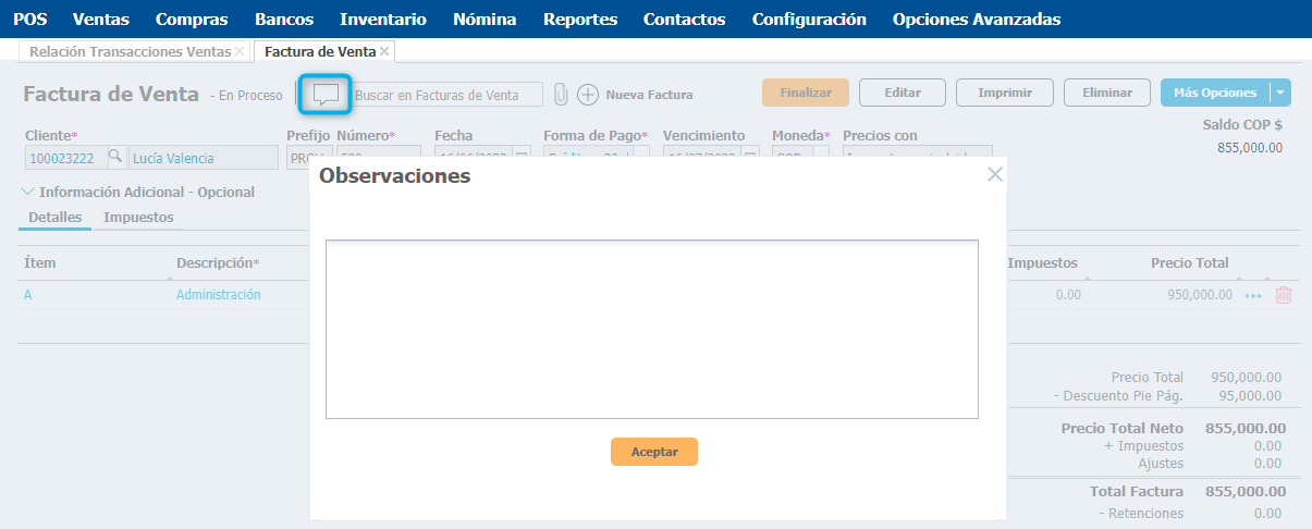 Cómo añadir comentarios, anotaciones u observaciones a una factura de venta
