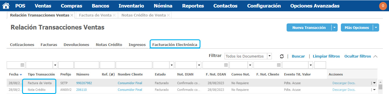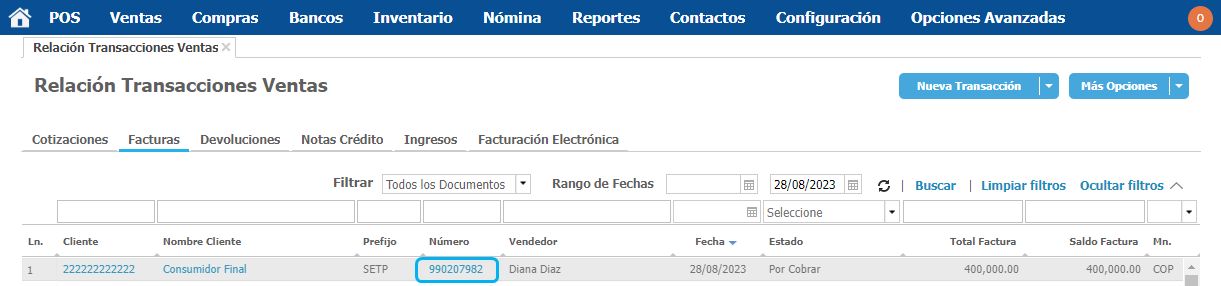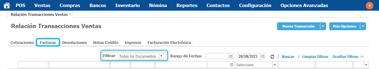 Ingresa al módulo de Ventas en la opción Relación Transacciones Ventas. En la nueva ventana da clic en la pestaña de Facturas. Recuerda que puedes utilizar los filtros para encontrar el documento más fácilmente, te recomendamos filtrar siempre por Todos los Documentos.