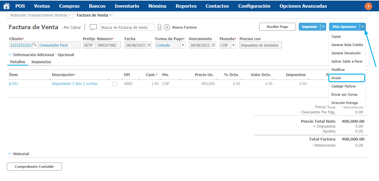 En la ventana Factura de Venta puedes ver toda la información de la transacción. En la parte superior derecha da clic en el botón Más Opciones → Anular