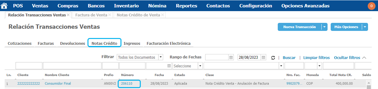 Para consultar la nota crédito realizada ingresa a la pestaña Relación Transacciones Ventas en la pestaña Notas Crédito.