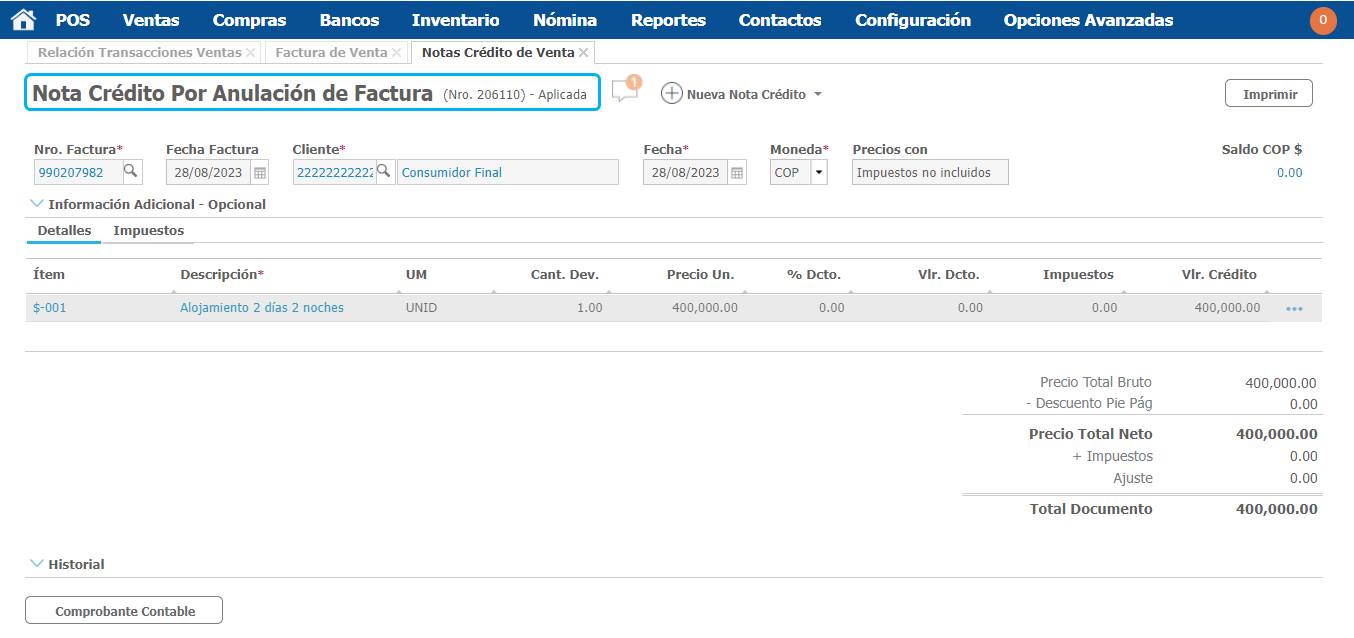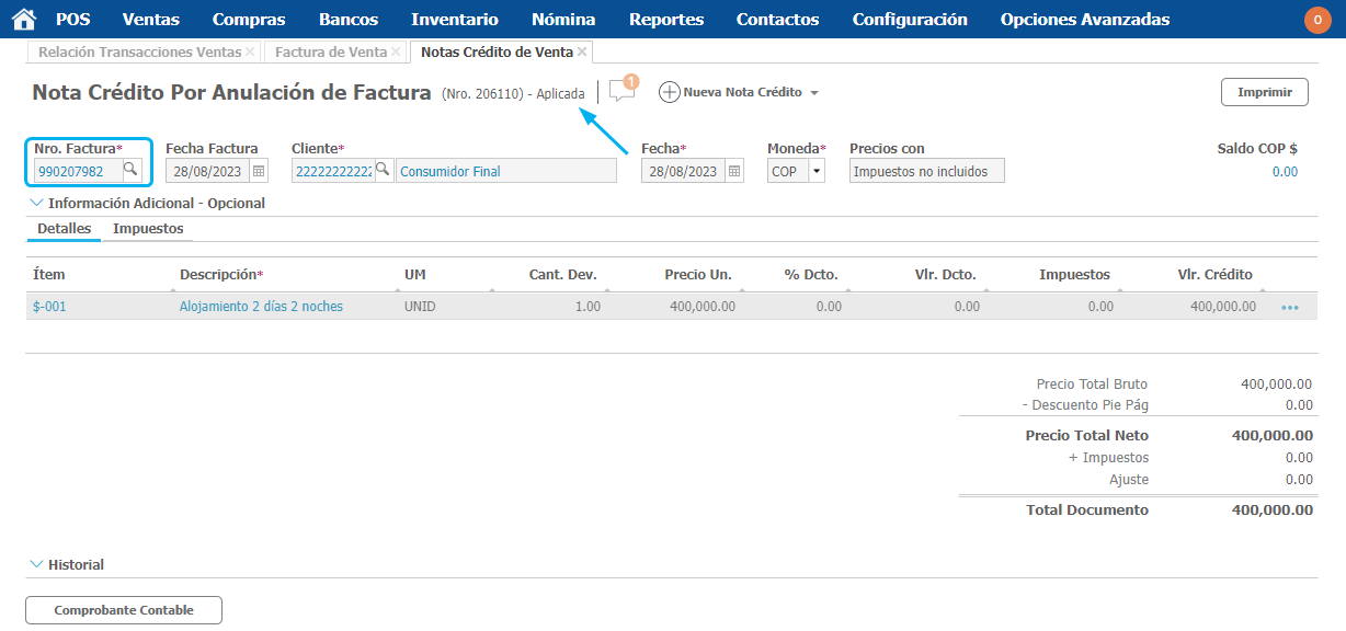 Al ingresar a la nota crédito podemos ver su estado y la factura a la cual esta relacionado el movimiento.