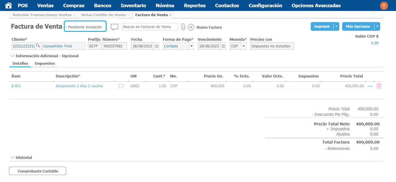 Si la factura es electrónica, esta quedará en un estado Pendiente Anulación.