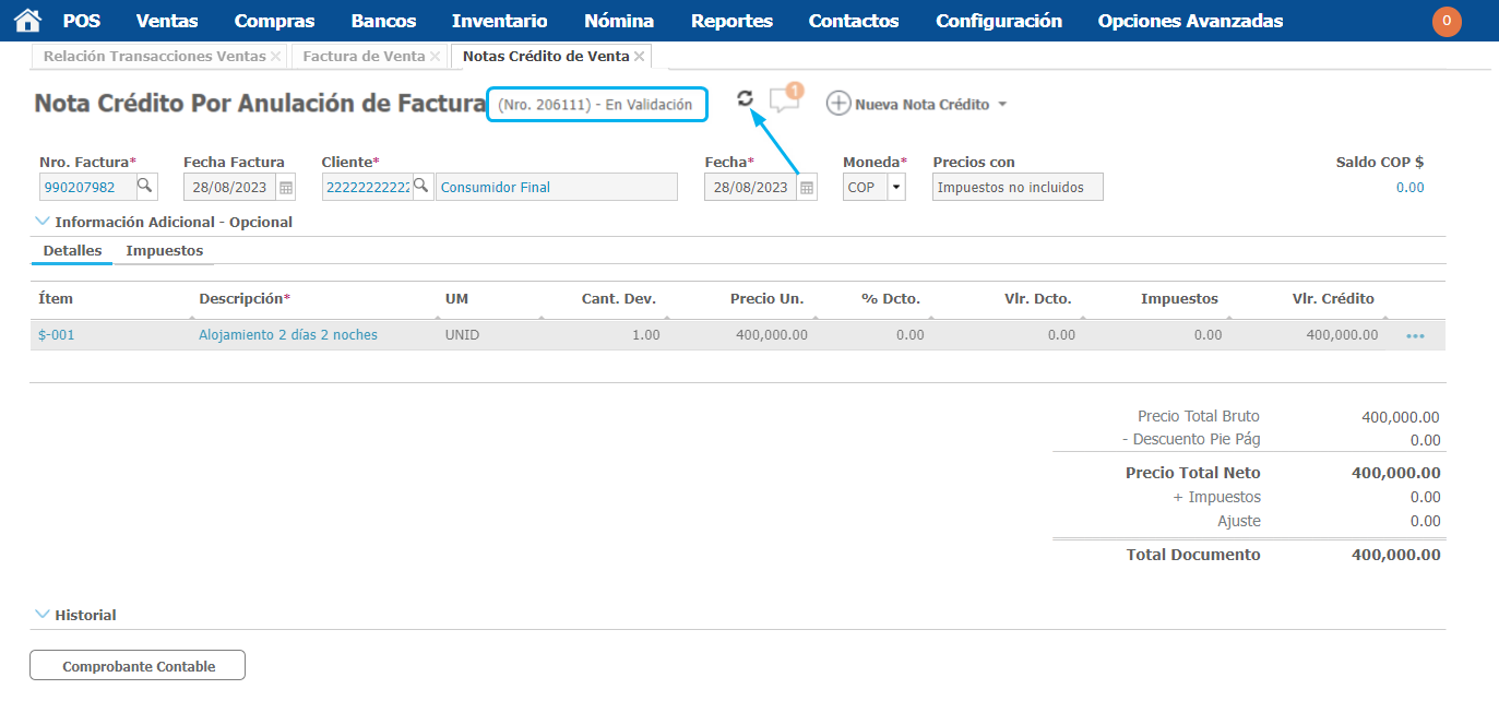 La nota crédito nos queda En Validación, se debe actualizar dando clic en el circulo al lado derecho del estado, para que cambie a Aplicada.