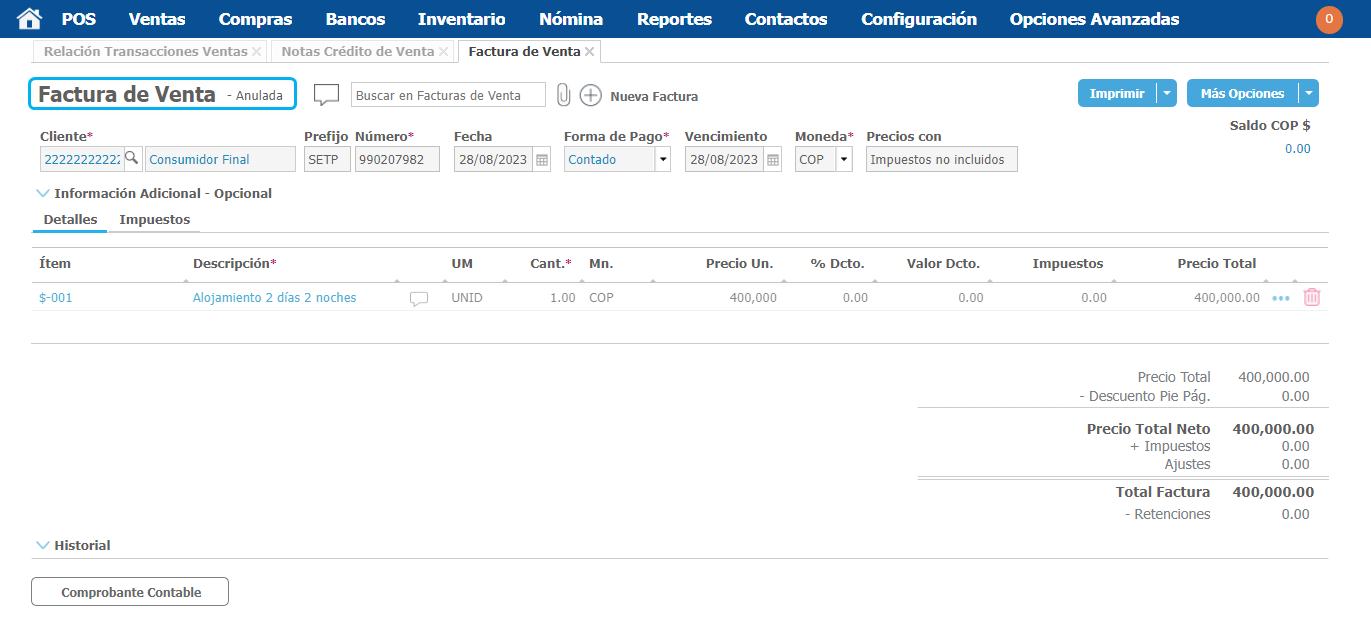 - Adicional se debe tener en cuenta que si la factura se encuentra en estado pagada, el ingreso también será anulado.