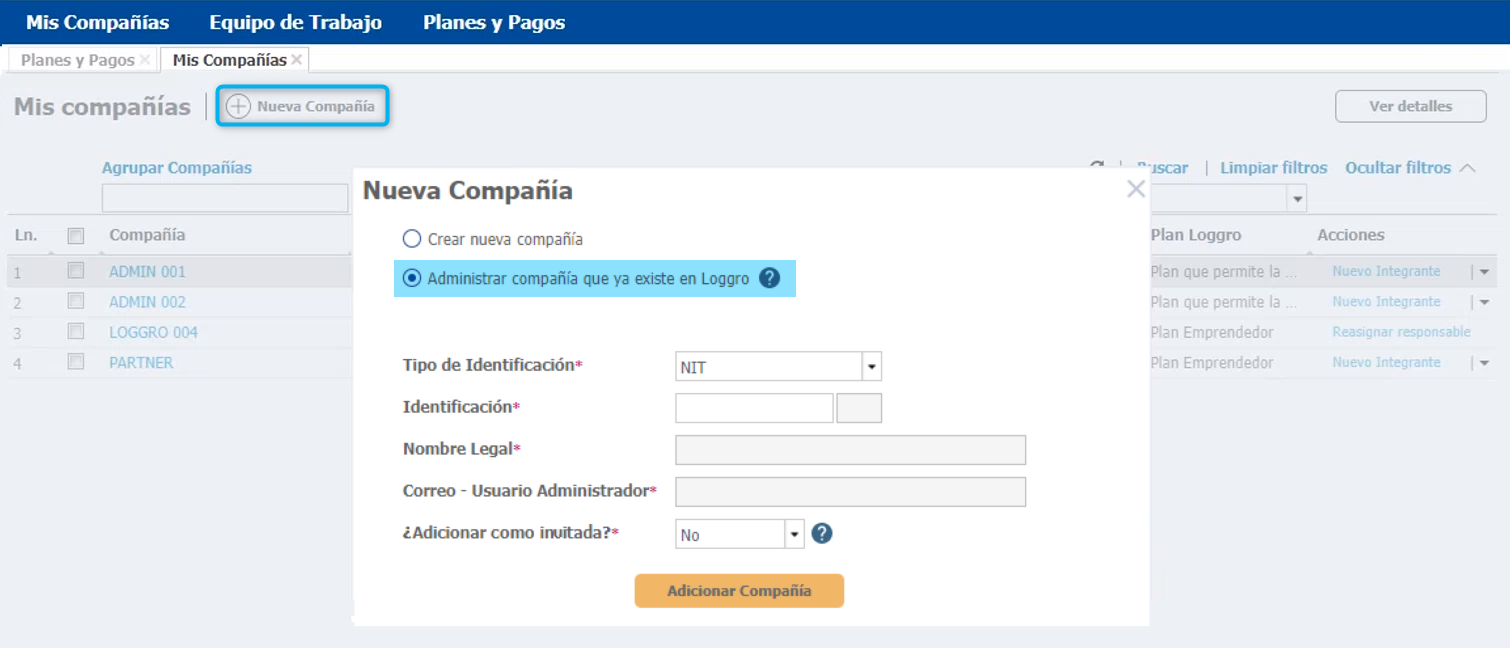 - Diligencia la información solicitada por el sistema, esta corresponde a la compañía (ya existente en Loggro) en la cual serás invitado y deseas adicionar a tu portal.