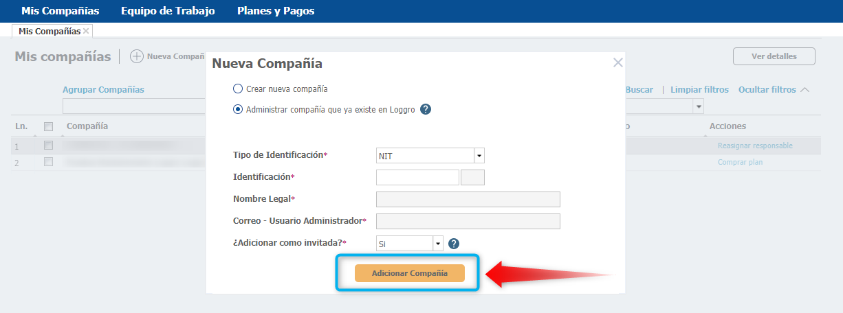 - En la nueva ventana debes seleccionar la opción Administrar compañía que ya existe en Loggro.
