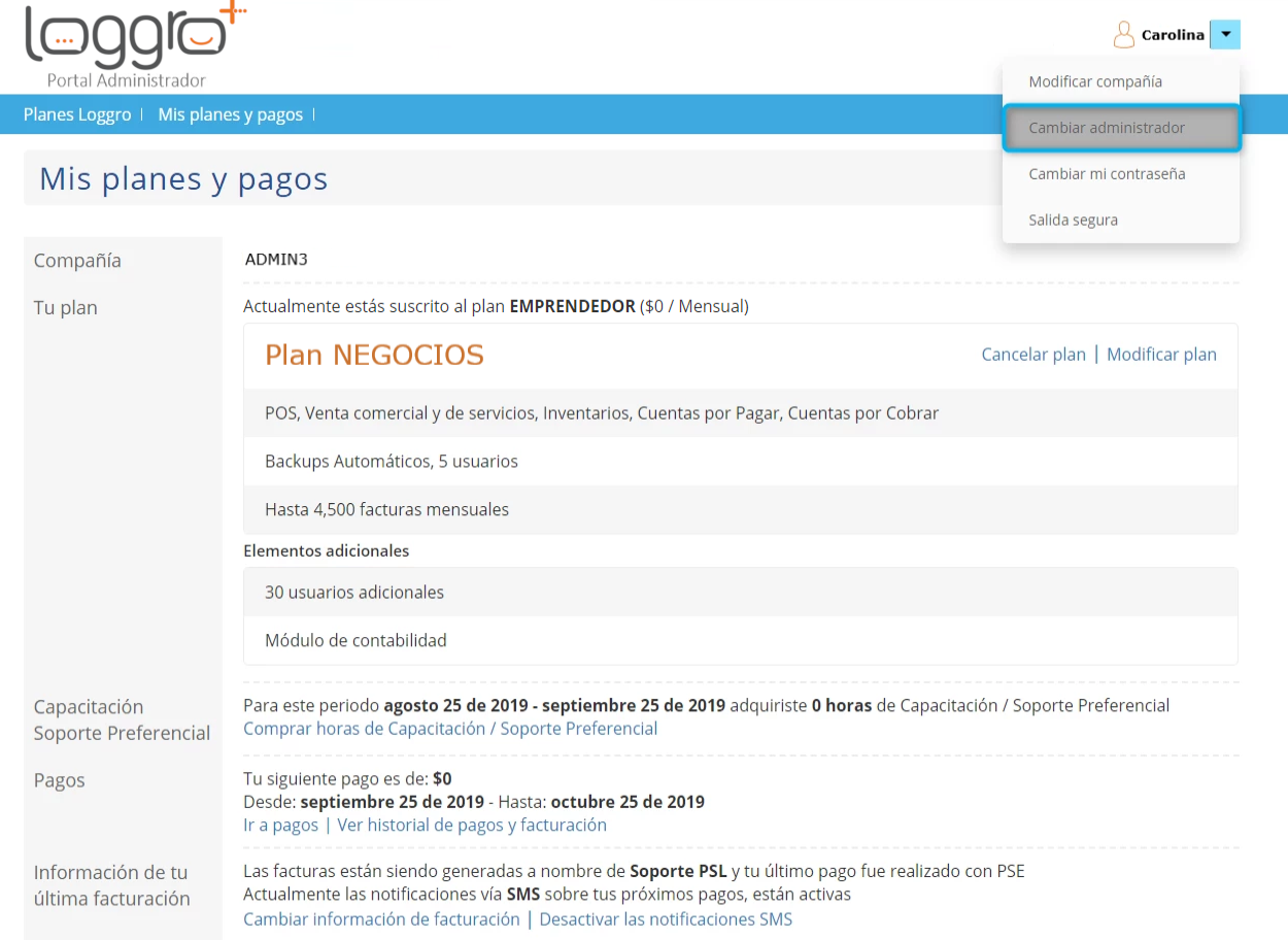 Al abrir la ventana del Portal Administrativo (Mis Planes y Pagos), debes desplegar el menú en la parte superior al lado del nombre y desde allí dar clic en Cambiar administrador.