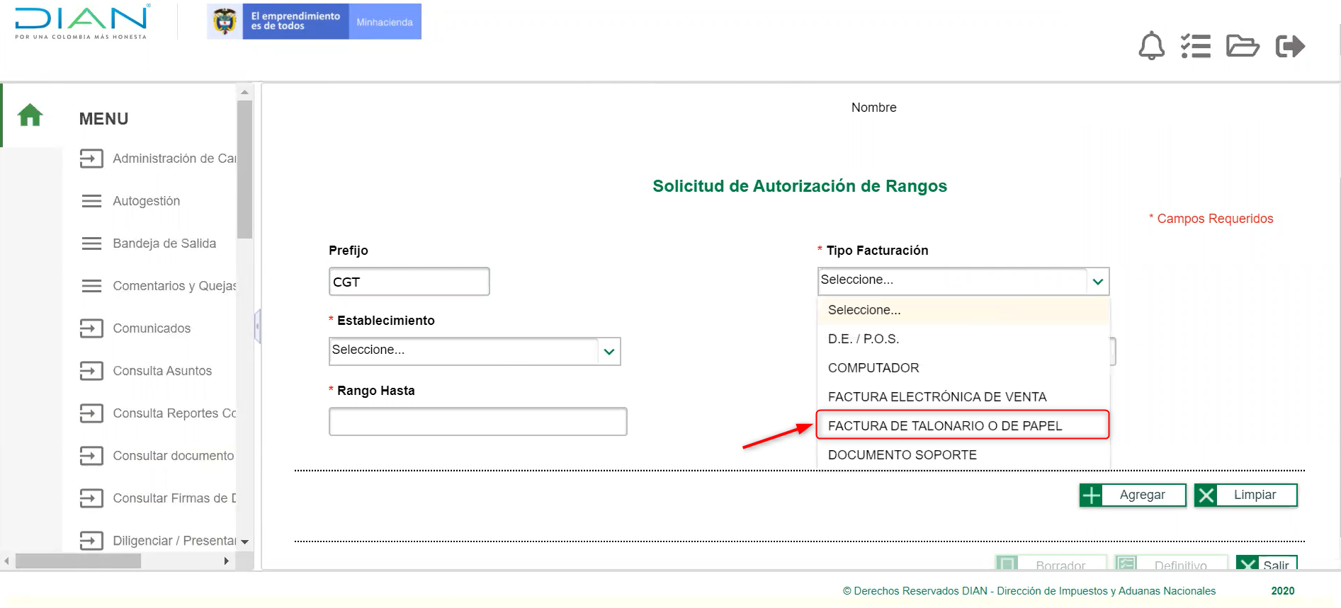 - Expedir una resolución en el sistema MUISCA de la DIAN, esta debe ser para el Tipo de Facturación: Factura de Talonario o de Papel.
