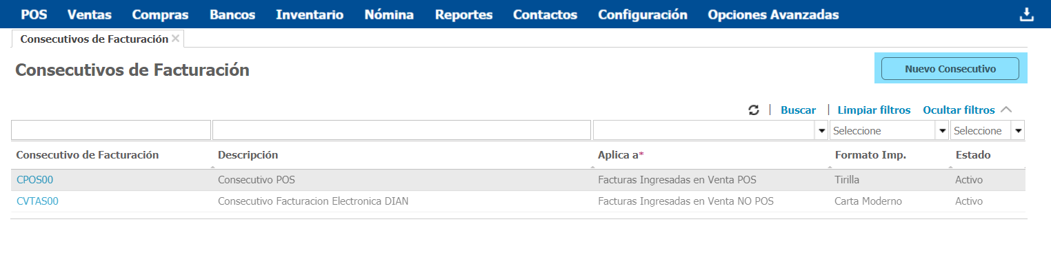 Este proceso lo realizas por la ruta Configuración → Consecutivos de Facturación. Allí debes dar clic en el botón Nuevo Consecutivo.