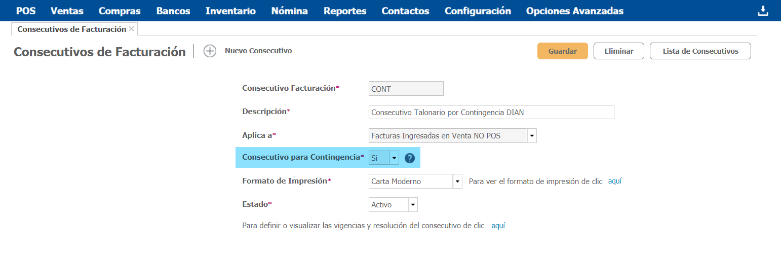 En la nueva ventana debes tramitar la información para crear el consecutivo y debes indicar Si en el campo Consecutivo para Contingencia.