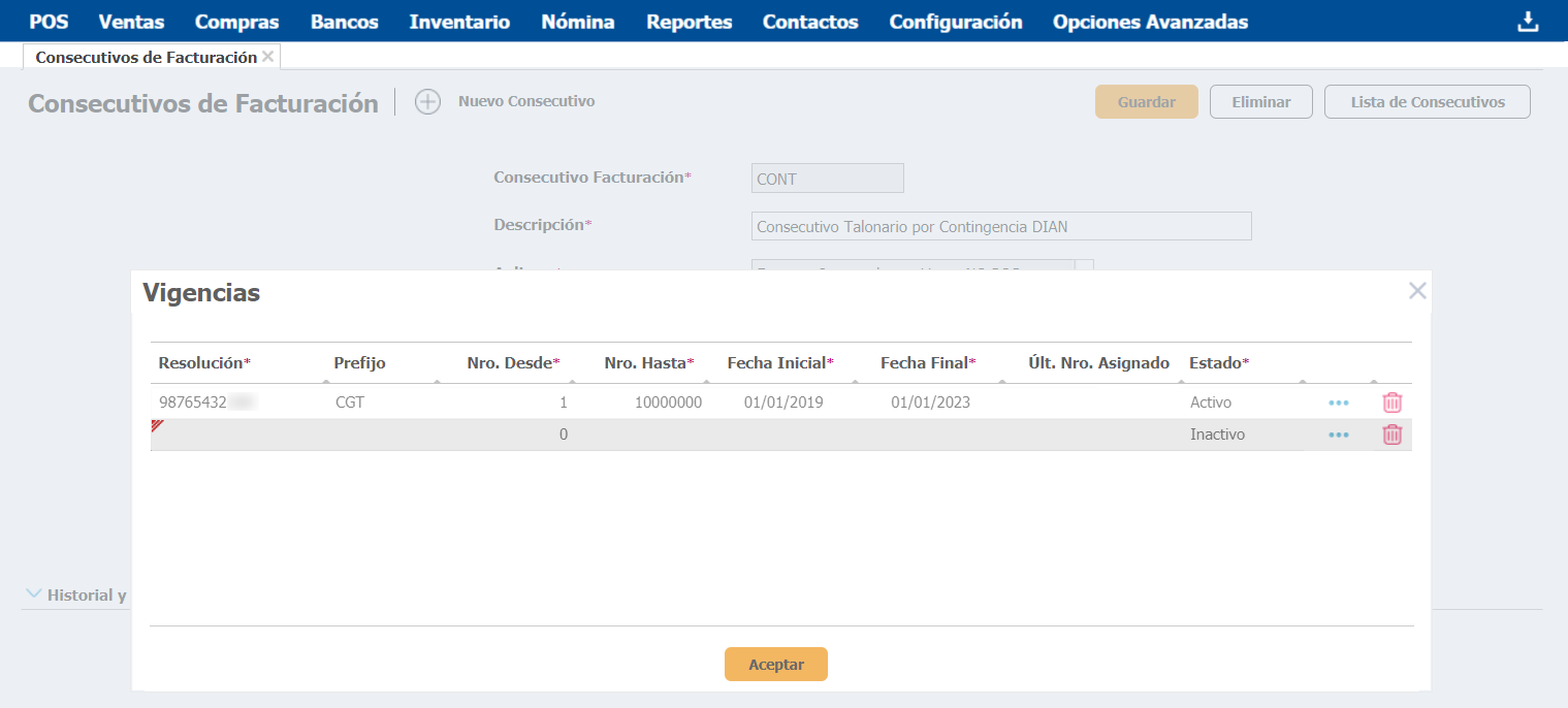 Debes indicar: el número de la resolución, el prefijo si aplica, número desde y hasta y el rango de fechas para la cual aplica según los meses que autorizó la DIAN en la resolución que te brindó. A continuación se muestra un ejemplo, debes verificar que la vigencia se encuentre con estado Activa.