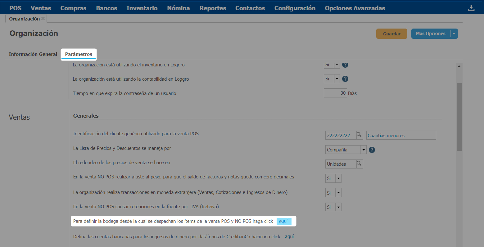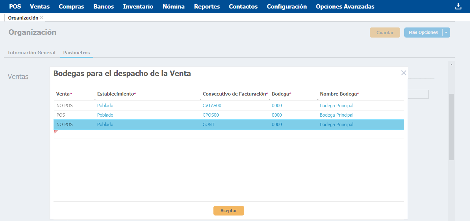 Por último, da clic en Aceptar y Guarda los cambios en la resolución para que estos se conserven. - Debes asociar el nuevo consecutivo por contingencia a la bodega respectiva, para esto debes dirigirte a Configuración → Organización → pestaña de Parámetros y ubicar la opción: "Para definir la bodega desde la cual se despachan los ítems de la venta POS y NO POS haga click aquí"