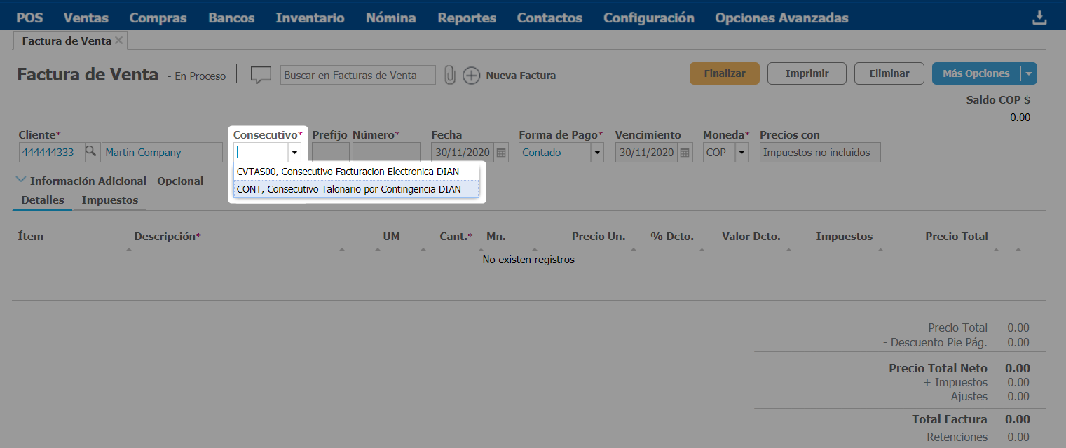 Ingresa a Ventas → Facturas de venta para tramitar los documentos y enviarlos a la DIAN. Desde la factura debes seleccionar el consecutivo a utilizar, en este caso el de contingencia.