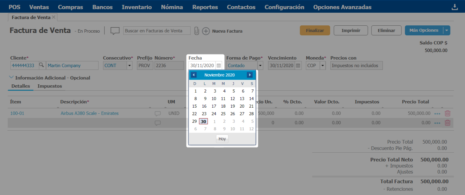 Es importante también que verifiques la fecha del documento, ya que esta debe ser la del día en que realmente se le facturó al cliente a papel. Solo en este caso de factura por contingencia el sistema te permitirá cambiar la fecha de la factura de venta.