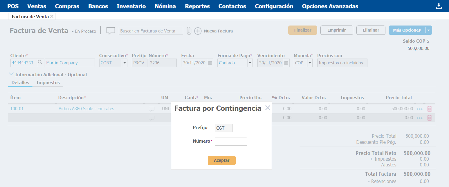 El sistema valida el número ingresado de acuerdo al rango que tiene configurada la resolución por contingencia. Si este se encuentra entre el número desde y hasta del consecutivo, se finaliza el documento y es enviado a la DIAN para su validación, recuerda actualizar el estado desde el botón