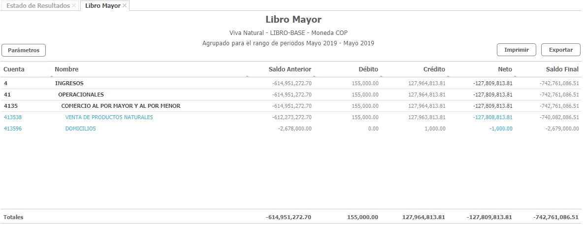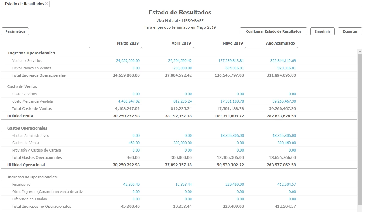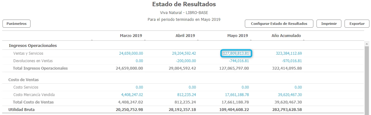 Cuando consultes el Estado de Resultados de acuerdo a tus necesidades puedes navegar en cada uno de los saldos que se encuentran en color azul, esto con el fin de conocer más a detalle los movimientos que lo generaron.