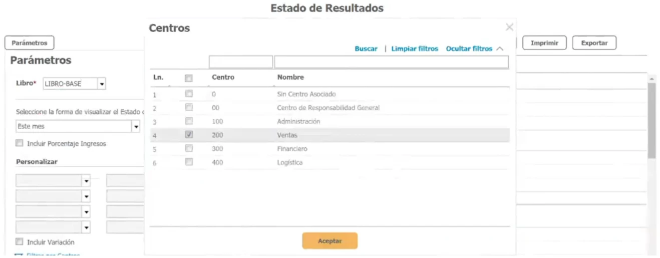 Desde el botón de Parámetros puedes seleccionar aquellas características a tener en cuenta en la consulta y definir si deseas consultar por algún Centro de Costo especifico.