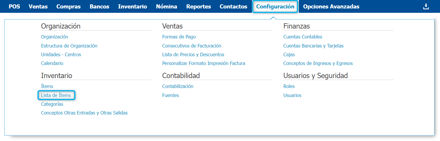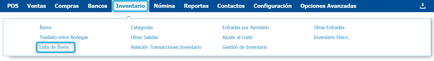 Si deseas consultar el listado completo de los ítems que tienes registrados en el sistema puedes realizarlo siguiendo la ruta: Inventario → Lista de ítems