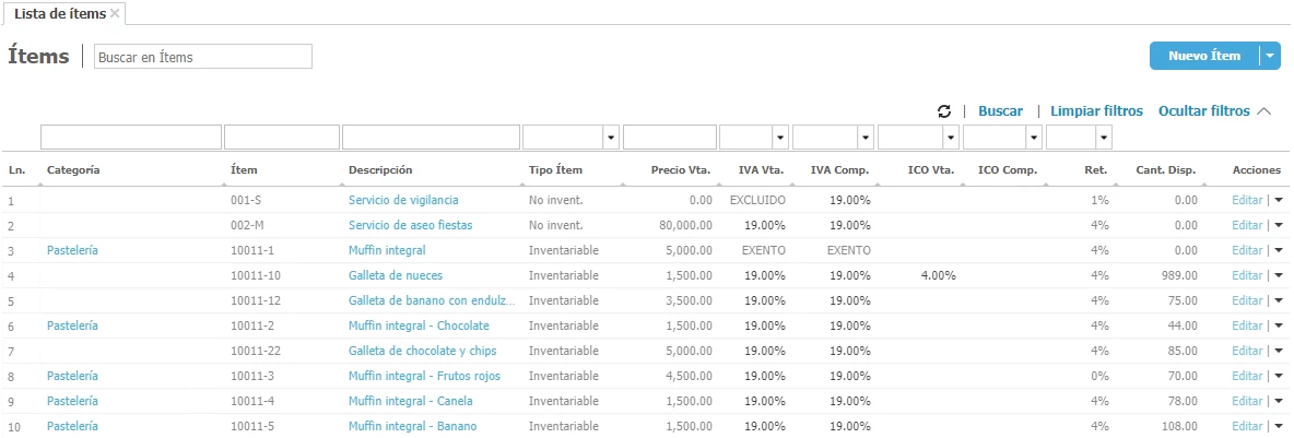 Puedes verificar fácilmente la lista de todos los ítems o productos que tienes creados en Loggro con su información básica.