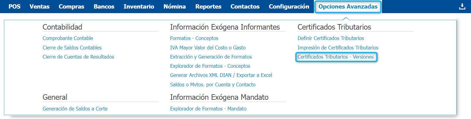 Para realizar la búsqueda te diriges a Opciones Avanzadas → Certificados Tributarios → Certificados Tributarios - Versiones