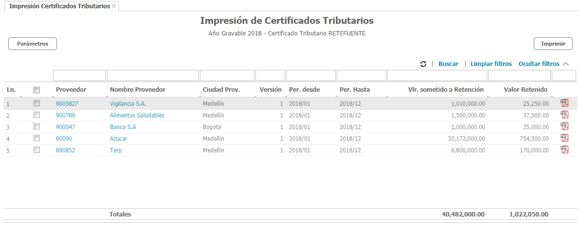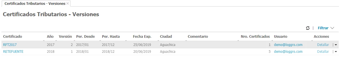 Desde esta opción podrás encontrar todos los certificados tributarios que has generado desde la Definición de Certificados Tributarios.