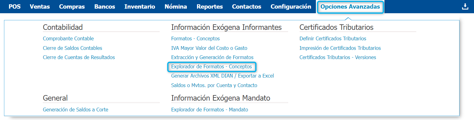 La información que se extrae para alimentar los formatos la puedes consultar por Opciones Avanzadas → Explorador de Formatos - Conceptos.