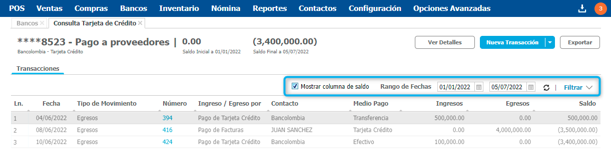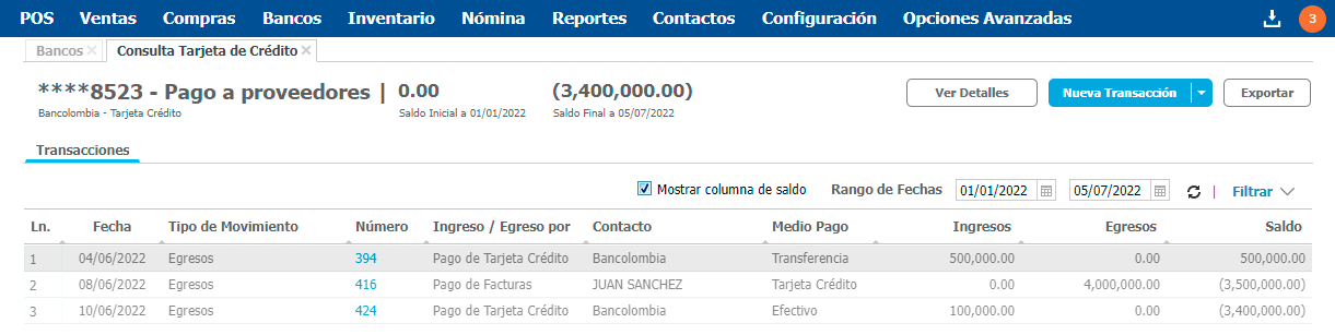 Si deseas consultar que tipo de transacciones o movimientos se han realizado en una tarjeta de crédito especifica solo debes dar clic en su código, este se visualiza en color azul.