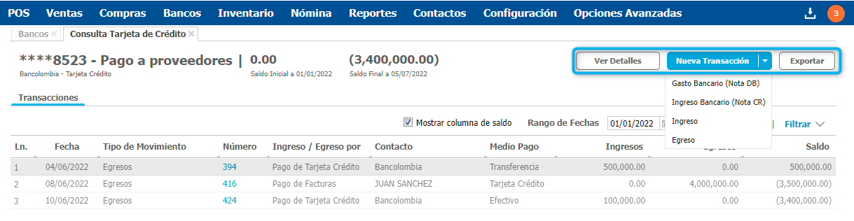 En el modulo de Bancos puedes verificar la información de tus tarjetas de crédito en la parte inferior de la ventana.