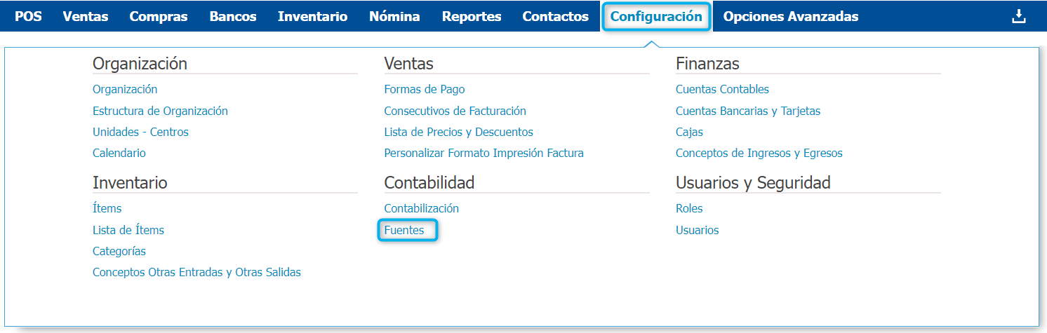 Para configurar las fuentes contables debes ingresar por la siguiente ruta: Configuración → Fuentes.