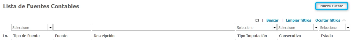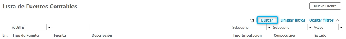 Al abrir la ventana, el sistema te traerá la lista de fuentes contables creadas anteriormente.