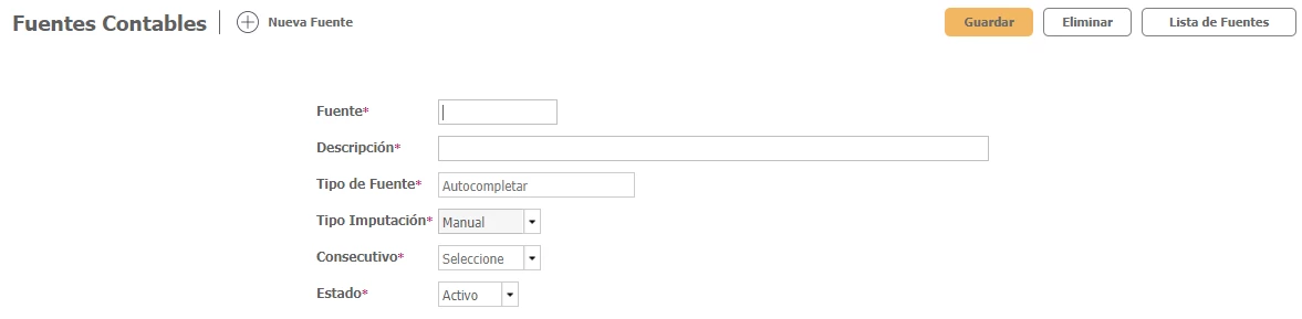 Todas las transacciones que realices en el sistema a través de sus diferentes módulos (Ventas, Compras, Finanzas e Inventario) tiene definida su fuente de forma predeterminada. Si deseas realizar comprobantes manuales o importarlos, se deben definir fuentes. Para más información sobre los comprobantes contables puedes ingresar aquí.