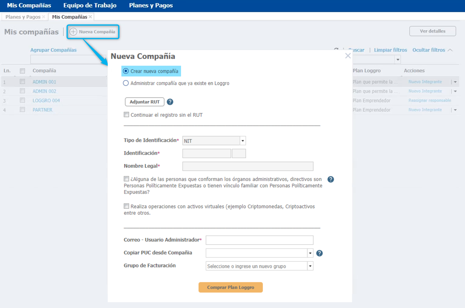 Para finalizar el proceso de la creación de la compañía desde tu portal debes dar clic en Comprar Plan Loggro, con esto el sistema te llevará al Portal Administrativo para que selecciones el plan a adquirir y generes la compra.