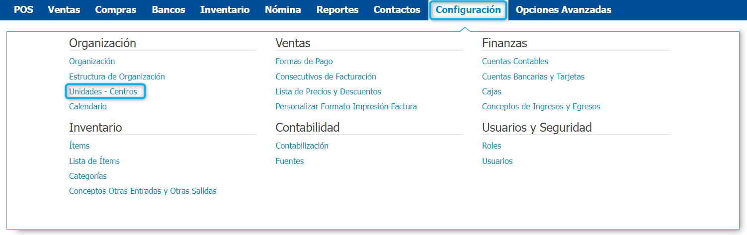 Para navegar a esta información te diriges a Configuración → Unidades – Centros.