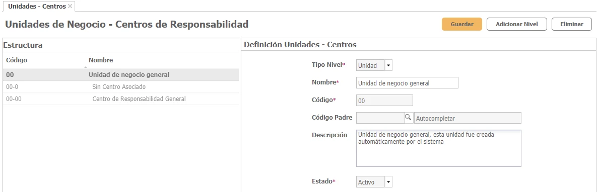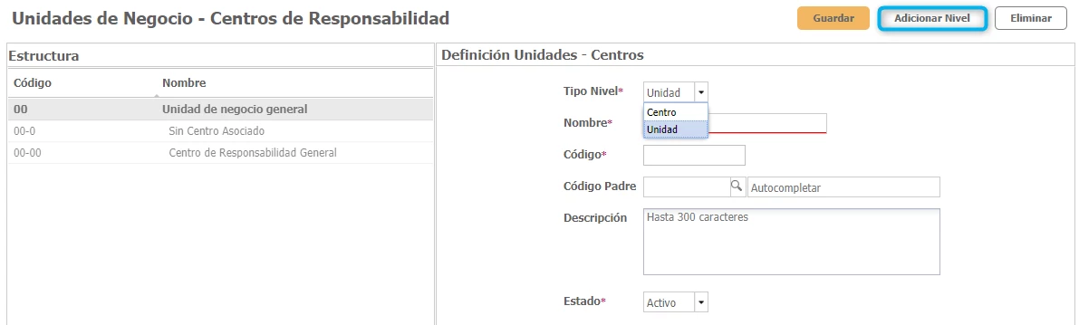 - El Tipo de Nivel, Unidad de negocio o Centro de responsabilidad.