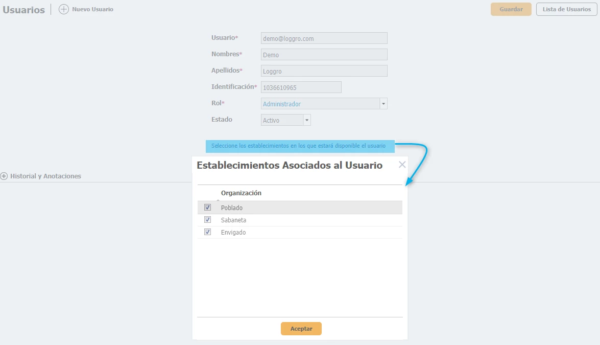 Para configurar esto, debes dar clic en el link “Selecciona los establecimientos en los que estará disponible el usuario” y así elegir los establecimientos a los que tu nuevo usuario podrá acceder.