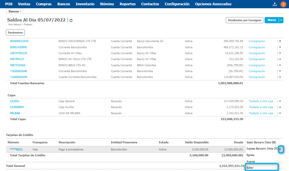 Ingresa al módulo de Bancos y en la sección Tarjetas de Crédito ubica la tarjeta que quieres editar. Da clic en el botón desplegable al final de la línea. Haz clic en Editar.