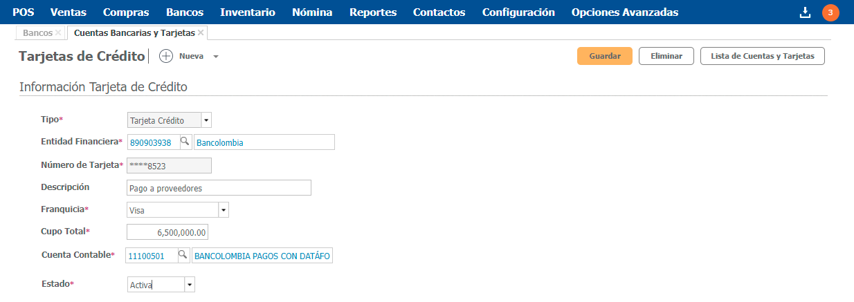 Permite consultar la información de creación de la tarjeta de crédito, desde esta puedes realizar modificaciones como la entidad financiera, descripción, franquicia, cupo total, cuenta contable asociada y cambiar el estado de la tarjeta.
