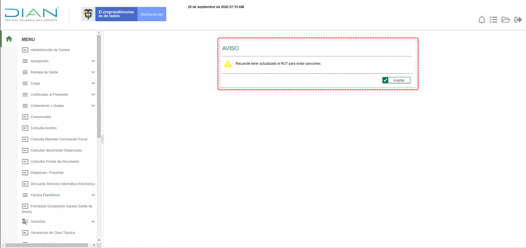 En la ventana aparecerá un mensaje informativo sobre la actualización del RUT, debes dar Aceptar en este.