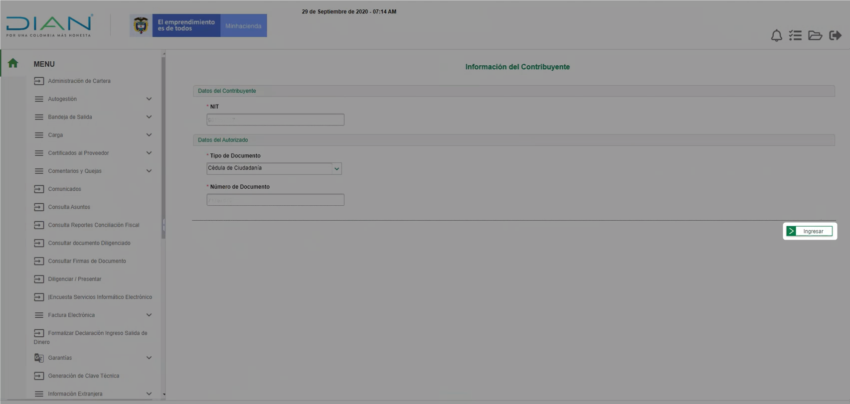 Luego se muestra la información del contribuyente y debes dar clic en Ingresar.