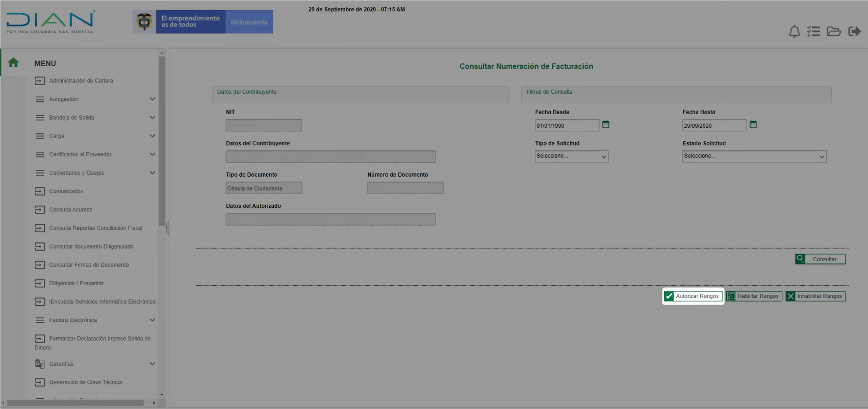 Con esto se abre la ventana para Consultar Numeración de Facturación con los datos de la compañía, allí debes dar clic en Autorizar Rangos.