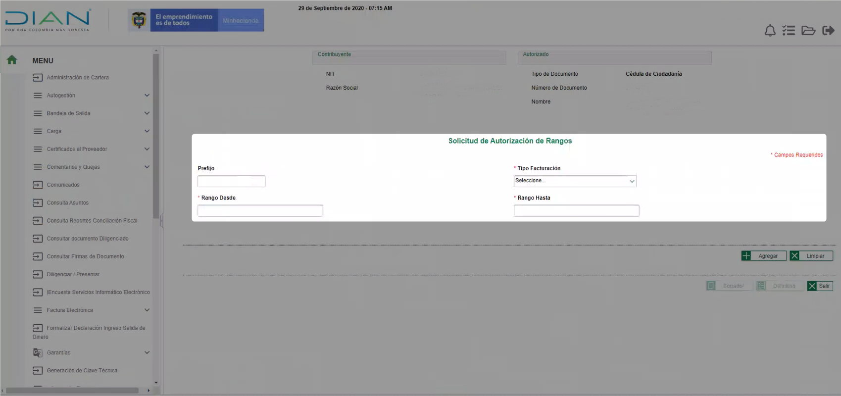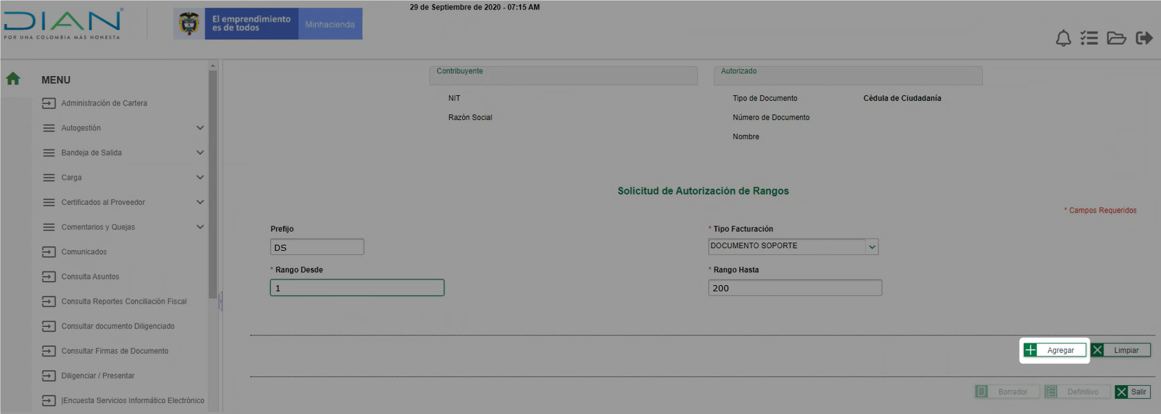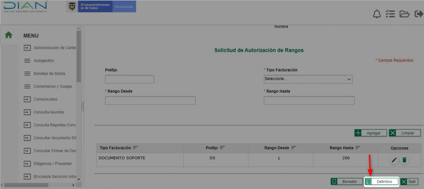 En la nueva ventana puedes visualizar la información de los rangos solicitados, desde allí debes dar clic en la opción de Borrador.