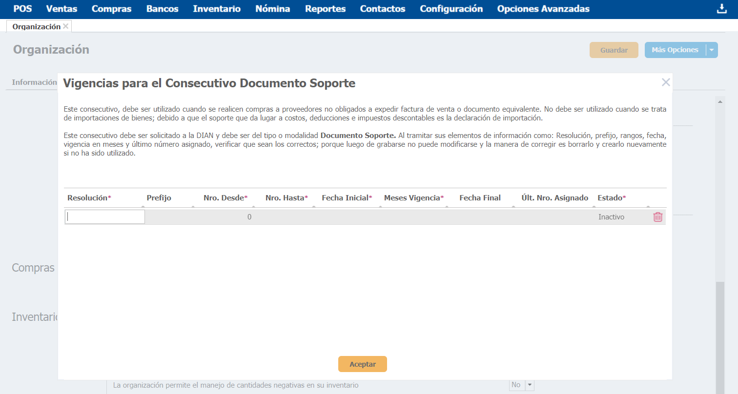 Con esto se abrirá una sub ventana donde encuentras información sobre el consecutivo de Documento Soporte y debes ingresar los datos relacionados a la resolución de este tipo que expediste.
