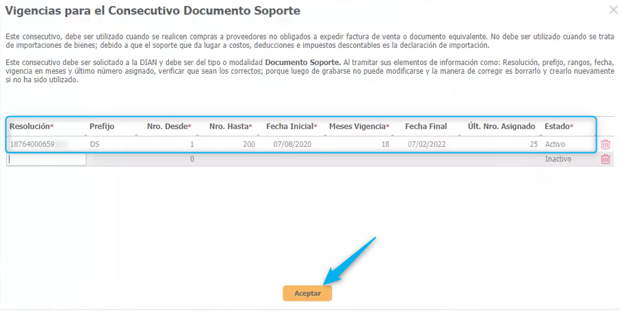 - Estado*: Despliega el menú y selecciona estado Activo para que puedas hacer uso de esta resolución en Documentos Soporte.