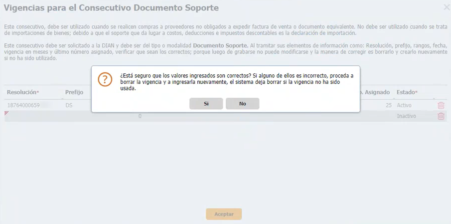 Al dar clic en Si, confirmas que la información ingresada es correcta y con esta resolución se registrarán los Documentos Soporte en Loggro.