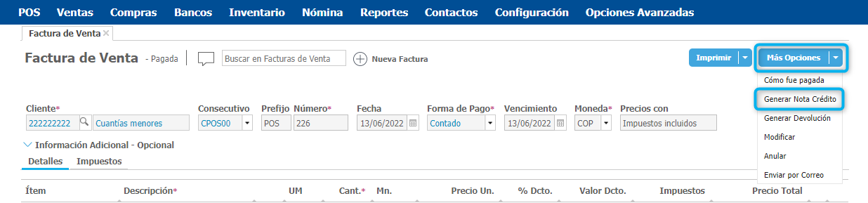 - Otra opción es entrar directamente desde la factura de venta. Debes ingresar a la factura y dar clic en el botón Más Opciones y en el desplegable en la opción Generar Nota Crédito.