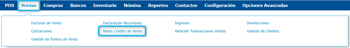 Ingresa por la ruta Ventas → Notas Crédito de Ventas