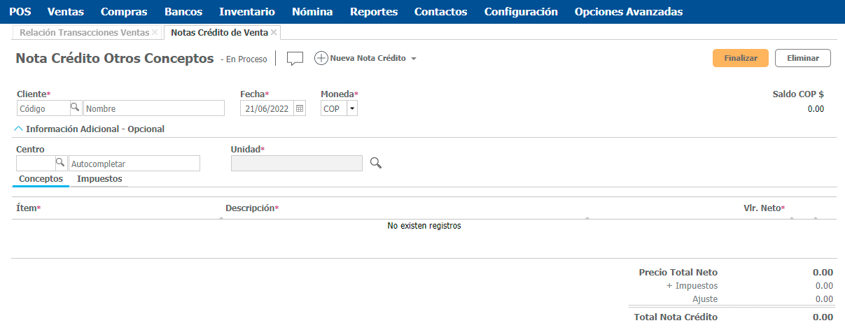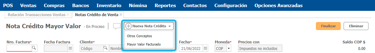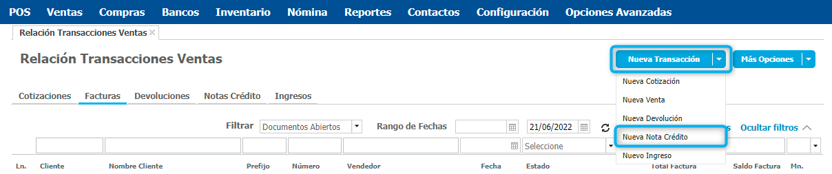 O por la ruta Ventas → Relación Transacciones Ventas en el botón Nueva Transacción en la opción Nueva Nota Crédito
